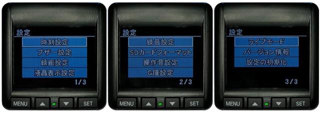 メニューボタンを押すして、矢印マークの付いた上下ボタンでメニューを選択して、SETボタンを押すだけです。