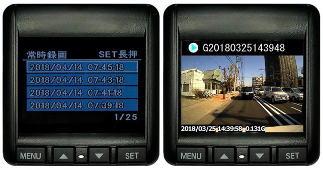 再生は、記録された動画ファイルが、タイムスタンプがファイル名として表示され、選択すると再生されます。