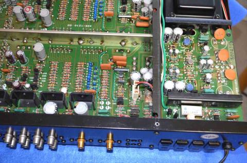 回路は左右にキチンと分かれています(後部:入力端子側が左CHです) 中央をアース兼用のステーでシールドしています(バスアースと言うらしいです)全体に作りが剛健です 鉄板も厚いしガッシリ作られていますね 華奢なところが無く立派です。