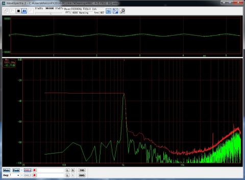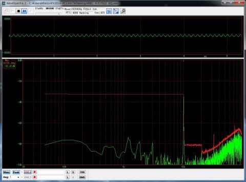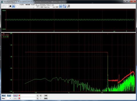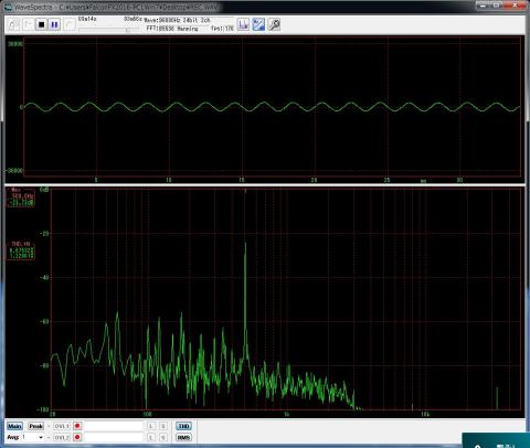 手持ちの発振器は歪率が悪いので、隣のPC上でWAVE GENというefuさんのソフトで発振させてアンプに入力して別PC上でWaveSpectraを動作させて測定してみた