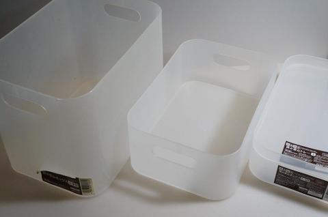 店頭ですでに変形のみられる製品も混在しているので、購入時には注意します。 - 他に、同じ開口サイズの箱で深さの異なる箱が2タイプと、積み重ねトレーという商品があって、全4タイプを重ねて使うことができます。