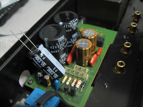 ルビコンのコンデンサー換装後 2本足になり小型化で耐圧も上がっている 42V→50V 両方とも3300μF