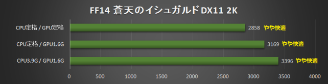FullHDでもやや快適となった。「やや快適」というと微妙な表現だが、FF14ベンチのページによると「普通」よりも1つランクが上であり、「余裕があればグラフィック設定の調整をお勧めします。」ということでデフォルト画質でプレイ分には問題ないだろう。