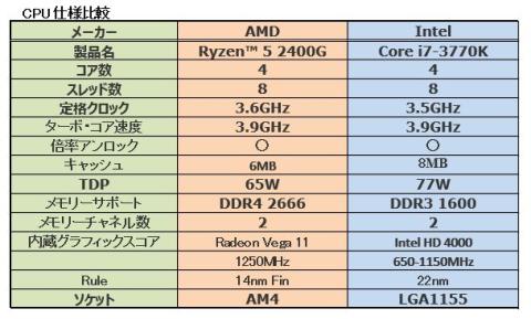 AMD Ryzen™ 5 2400Gは,普通にゲームができるAPUであることがわかりましたが,同じCPU+iGPU構成のi7-3770Kと,もう少し比較してみたいと思います.