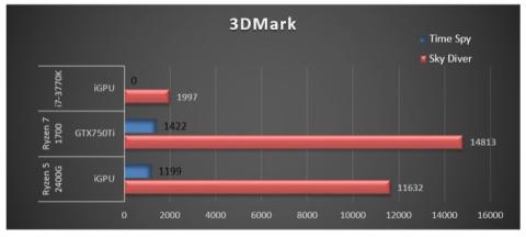 DirectX対応世代が違うため,同じ土俵でみたSky Diverでも,i7-3770Kに対し5倍以上のスコア差,AMD Ryzen™ 7 1700とGTX750Tiに対して3割以下でのスコア差です.Time Spyになると,AMD Ryzen™ 7 1700とGTX750Tiとのスコア差は2割以下に縮まります.今回使用したメモリは,DDR4-2666ですが,更に高速なメモリを使うと差が縮まって,1割程度の差になると思われます.