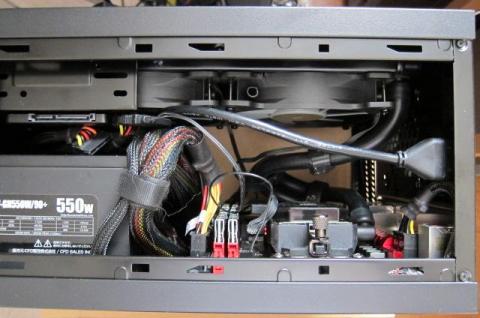ATX電源をminimo-Qに取り付けます.KRPW-GN550Wは,モジュラー式ではないので,使用しないケーブルの処理も肝です.Minimo-Qでは,電源と5インチベイの間の隙間に収容しています.