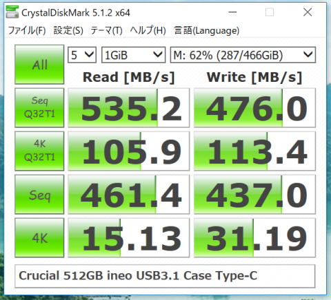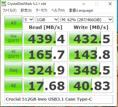 肝心の性能ですがType-C(Thunderbolt)のPCで測定