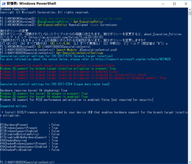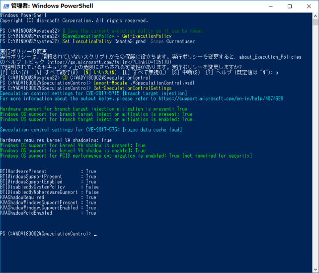 この1803を締めくくるにあたり、2018/11/13発表の新たな7個の脆弱性が発表される以前のCPU脆弱性はPwerShellで確認出来る物を信じる事にしました。
