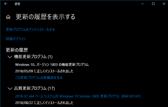 一度、累積アップデート「KB4100403」は失敗してる、「KB4100403」が入った事でOSビルドは17134.81に上がった。
