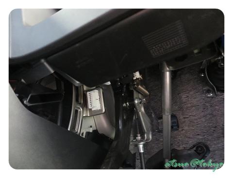 エルグランドの OBD II接続端子はハンドル右下にあるポケットの裏になります。