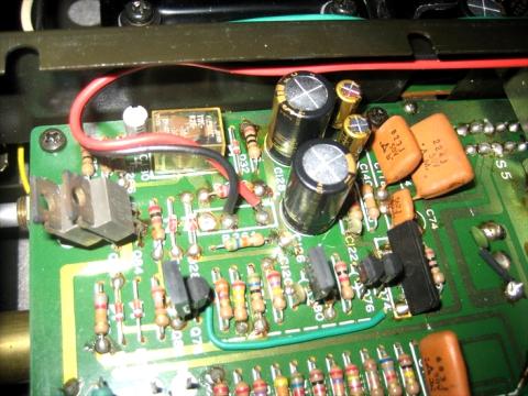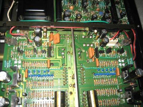 ↓左右とも交換したところ このアンプはフレームやボリュームシャフト、ファンクションシャフトが有り、その下の部品交換は非常にやりづらい...おまけにスルーホールパターンですから部品がなかなか外れない...ナンテコッタ、パンナコッタ