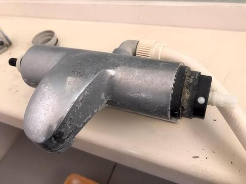 中身はこちらとなります。何というか、素人が見てもこの構造や形状の必然性は理解できませんね…。ただ、この類の部品が耐用年数5~6年というのは少々短い気もします。ユニットバス自体はもう少し長持ちしますからね。