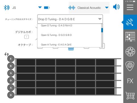 で、ここまでは本体だけでも出来るのですが、jamstkPlus アプリを使う事で Drop D や Open G など、カポだけでは実現できないチューニングに変更することが出来ます。