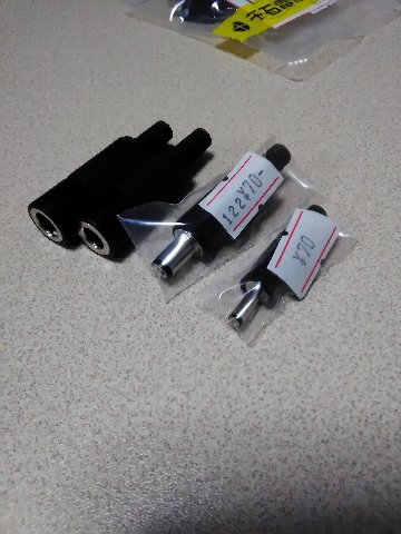 他の部品も映っていますが、左から、EIAJ type-5の中継用DCジャック(\130)、EIAJ type-4用の中継用DCジャック(\130)、内径2.5mm DCプラグ(\70)、内径1.1mm DCプラグ(\70)です。