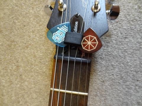 練習などでは、ネックにピックホルダーがあっても問題なさそうですが、ライブなどで演奏中にピック落とした時などすぐに取り外して…という場合は、ネック部分にあるのですぐに外して演奏は難しいかもしれません。