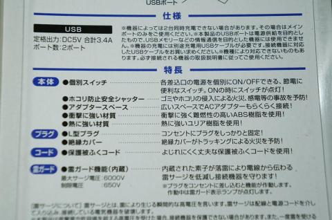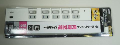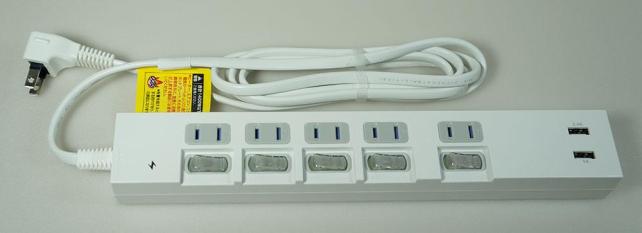 ACのアウトレットが5口と充電用USBポートが2口付いたタップです。