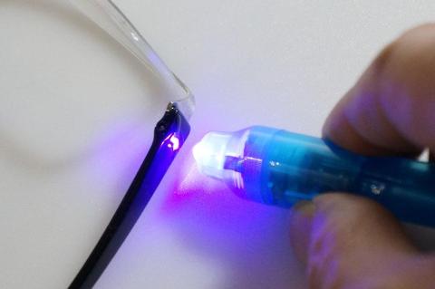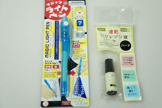 UVレジン液は、紫外線を当てると固まる液体です(手芸関係の売り場にありました)。マジックライトペン(文具コーナーでした)のライトの方に紫外光(UV光)の出るLEDが仕込まれていて、UVレジンを固めることができるとの情報がネットにありました。