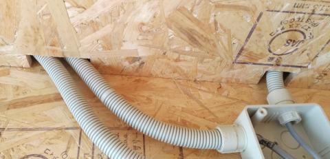 通線スライダーを吹きまくり何とかPF管へ通線することが出来ました!これ、最低な通線方法なのでマネしないでくださいね。プロの方のアドバイスによれば、PF管は出来る限り真っすぐにしてからVVFケーブルを通すのが筋だそうですよ。これからやる方はこれを参考にしてください。_(._.)_
