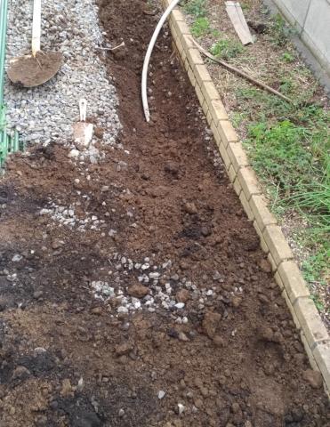 まぁまぁ深く埋める必要があります。画像だと10cm程度に見えるかも知れませんが、30cm以上掘って埋めてます。最初に敷いた砂利が邪魔をして、掘ったそばから穴に転がってきて邪魔でした。PF管周りの石で穴でも開いたら大変です。可能な限り小石は無い状態で埋設します。