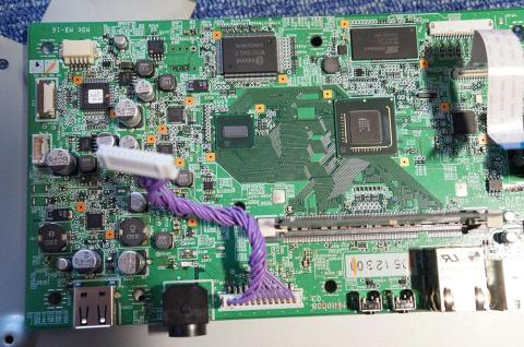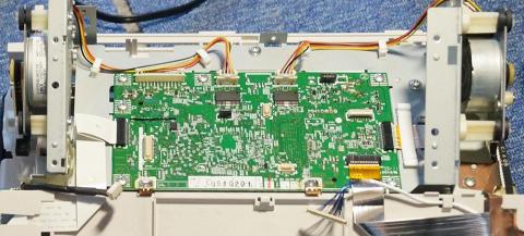 操作パネル裏の基板はスキャナ装置の駆動を担っているようです(紙送りモーター、読み取りセンサーへ行く配線があります)。