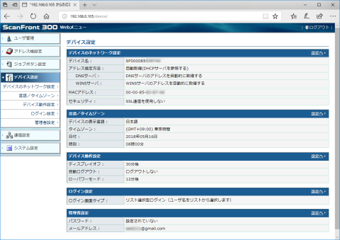 転送先の登録などの事前の設定操作は、操作パネルからでも、他のPCのブラウザから開く本体のWeb画面からでも行なえます。ただし、本体のWeb画面は、どいうわけか Chromeからはログインできず、Microsoft Edge では開くことができました。