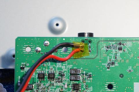 メイン基板のACアダプタの入力コネクタのパターンから、線を引き出し、汎用のDCプラグ(外径5.5 x 内径 2.1)が挿せるようにしました。専用ACアダプタのコネクタ形状が特殊で不便なための対応で、これが分解の理由です。