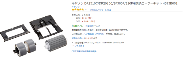 同世代の他社製ドキュメントスキャナでも同様の交換パーツが準備されています。(参考:FujitsuのS500やS1500は 交換目安は同じで約10,000円、EPSONのDS-570Wなどは 20万スキャン目安で 約6,000円)。