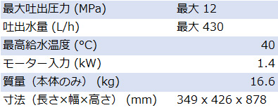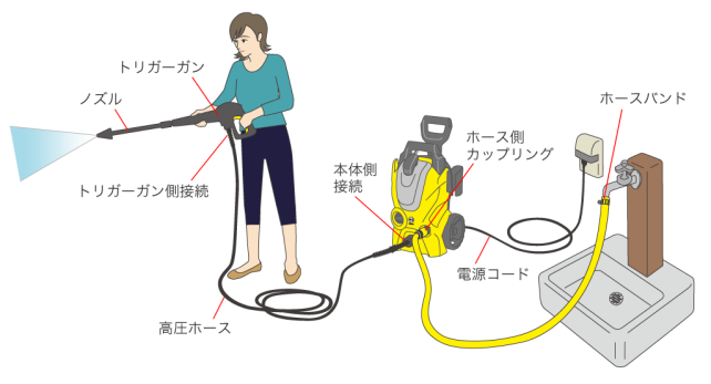 高圧洗浄機は、水道蛇口からの水を、内部の高圧モーターで圧縮し、ノズルから勢いよく噴出させるものなので、当然ながら圧縮モーター用の電源も必要です。(1,400W)