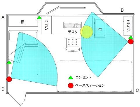 しかしB点はエアコンがあるためコンセント上部に。D点はベットが邪魔なので延長する計画です。