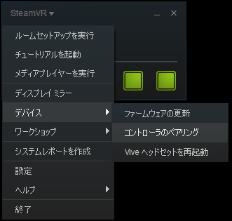 ここで左上のSteamVRタブから「デバイス」→「コントローラーのペアリング」に進み