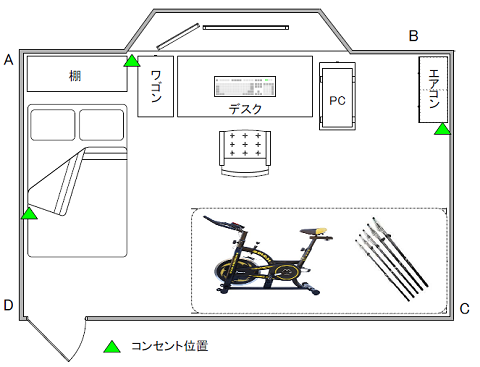 コンセントの位置が偏っておりC点方向にはコンセントが無いと今頃部屋作りに失敗したと後悔しています。今は健康の為いずれ使うであろうスピンバイクや釣り道具が占領しており全く設置出来ない状況であります。はははのはー