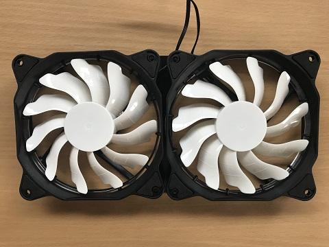 えっと、おもちゃみたいな白い120φファンが2つあるのでコレを付けようかと思います。