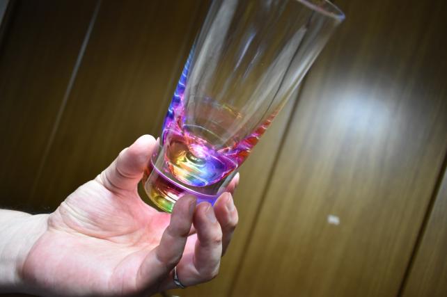 が、どういう仕組か見る角度でタンブラー全体が美しい虹色に染まるのです。単純にきれい!