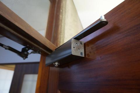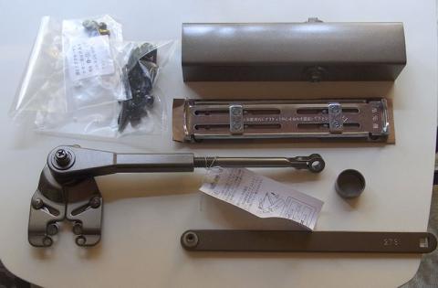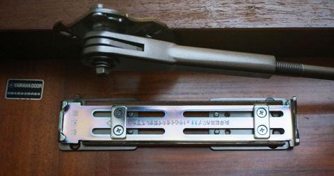 まだ本体とアームが外れた状態。ここでドアが閉まっている時ドアとアームが平行になる程度にアーム長さを調整して、その後力ずくで本体側のアームをひっぱって取り付ける。これが結構力がいるし特にアームを押し込むのが硬い。取付では一番ココが手間取った。