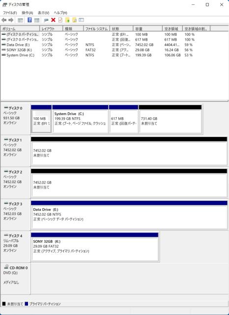 この状態で、Windows 11を起動して、ディスクの管理を開くと、8TB HDD 2台が未割当で、オンライン状態になっています。