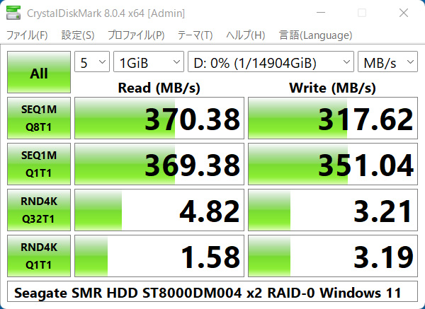 因みに、DiskMarkを走らせてみると、HDD単体の速度です。
