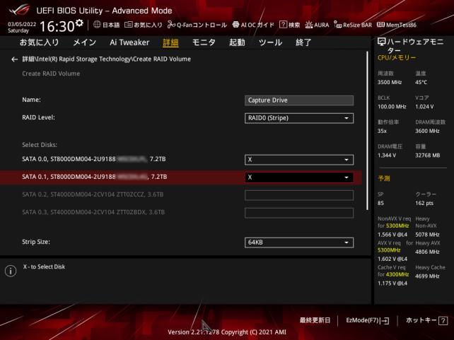 Windows 10 Proから、Windows 11 Proに無償アップデートして運用を始めたところ、Caputure Driveとして、RAID-0で構成していた8TB HDD X2の片方が、Intel Rapid Strage Managerから外れてしまい、RAID構成が壊れてしまいました。