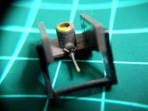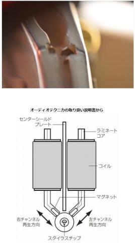 上画像のコイルの鉄心軸が(針差し込み部側の)反対側の針差し込み部に頭を出してますので(下画像)、下画像の円形の部分に針を差し込むとギャップの間にマグネットが装着されます 針が振動するとマグネットが振動して発電します。 (↓イラスト参照) この画像はAT-15Eaです