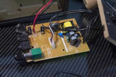 ケーブルが大量に出ていますが、電源ケーブル、入力端子、マイク端子(フロントパネルにマイクを接続)、L側スピーカーケーブルと4本出ています。