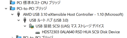 デバイスマネージャでの表示。確かにUASP (USB Attached SCSI Protocol) 対応の様です。