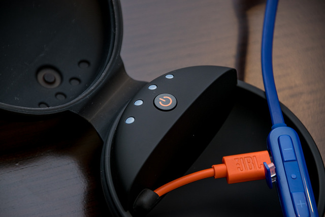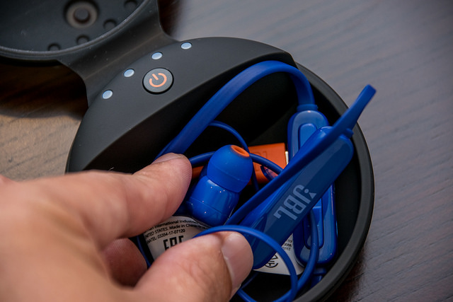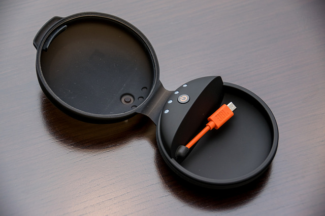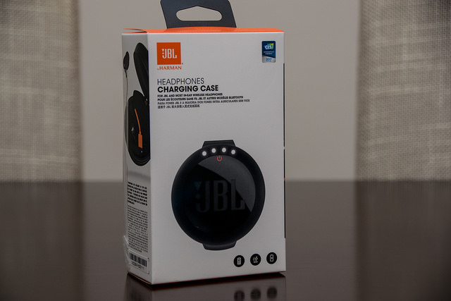 また、今回は一緒に専用の充電ケース「JBL HEADPHONES CHARGING CASE」も手に入れました。外装はハードケースというよりもシリコン素材のケーブルリールのように見えますね。