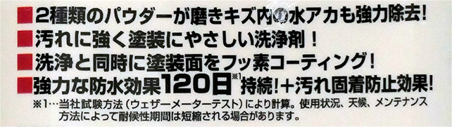 このクリーナーは、大小2種の洗浄パウダーが、ボディの表面の水アカから、小さなキズに入り込んでしまった水アカまでしっかり落とし、再付着も防ぐそうです。