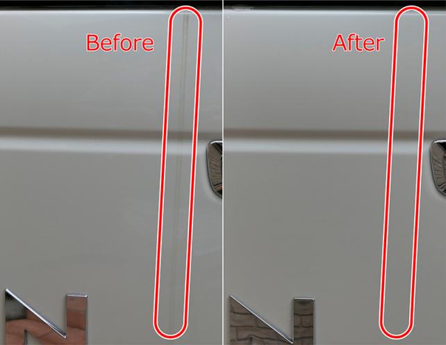 上記は、リアハッチドアです。雨後は、リアウィンドウのワイパーの端から雨水が垂れて、写真左(Before)のように黒っぽい筋が出てしまいます。