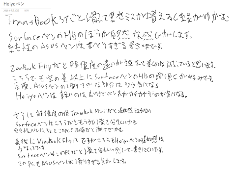 試し書きした感じだと比較的高性能なTransBook3やZenBookFlipでは線がゆがみやすかったり、