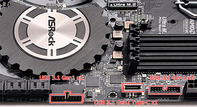 AsRock Z370 Taichi には、USB 3.0 x2用のピンヘッダが2基、USB 3.1 Type-C Gen2 x1用のピンヘッダが1基あります。