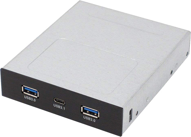 これは、マザーボード上の、USB Type-C Gen2用ピンヘッダと、同じくマザーボード上の USB 3.0 Gen1 x2のピンヘッダを使い、3.5インチベイに、USB 3.0 Standard-A x2(Gen1)と、USB 3.1 Type-C x1(Gen2)を増設するものです。