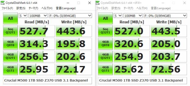 再度、USB 3.1Gen2対応USBケースにCrucial M500 SSDを搭載して、マザーボードのバックパネルに出ているUSB 3.1 Type-C(Gen2)に接続します。