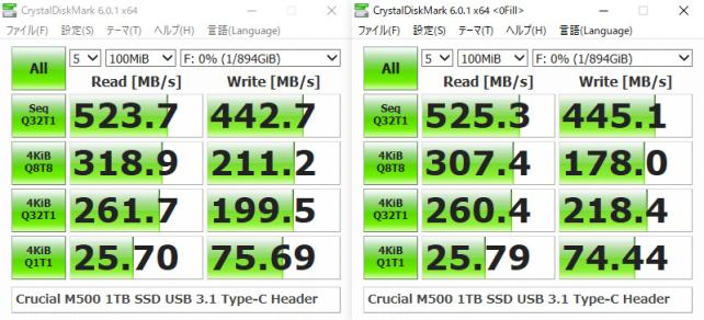Crucial製1TB SSDを、USB 3.1 Gen2対応のSSDケースに入れて、Crystal DsikMarkで計測しました。