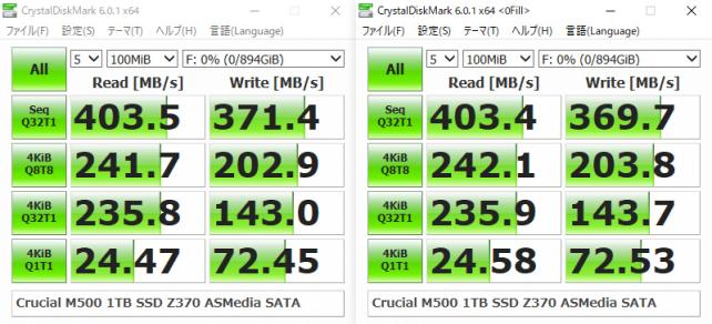 このスコアを見ると、USB 3.1 Type-C(Gen2)に接続すると、ASMedia製SATAポートに接続するより高速に利用することが出来るようです。