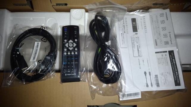 同梱物は「モニター本体(ネック部取り付け済み)」「台座」「リモコン(単4電池付属)」「電源ケーブル x1」「ディスプレイポートケーブル x1」「取扱説明書」が入っています。
